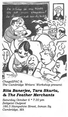 For the first time at the Zeitgeist Outpost, Rita Banerjee, Tara Skurtu, and The Feather Merchants will create a salon atmosphere where poetry, music, & folk-salon hijinks meet! Cambridge Writers’ Workshop Co-Director poet Rita Banerjee will host the evening, and will offer interludes of poetry with poet Tara Skurtu. The Feather Merchants will play originals and arrangements of Steely, Johnny, and The Black Keys.