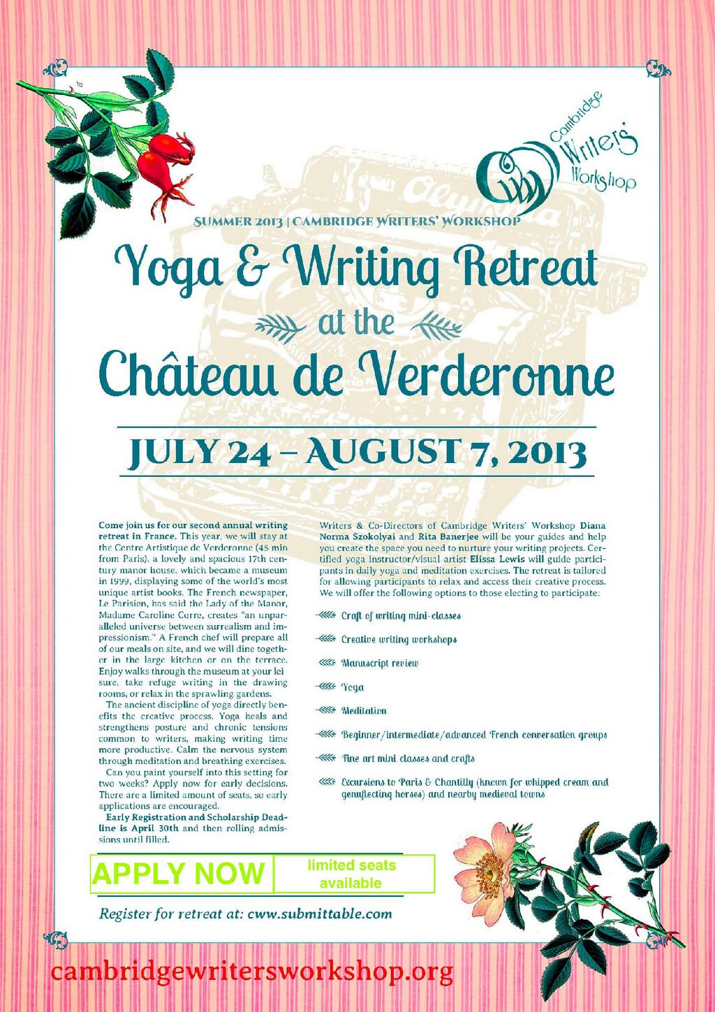 Come join the Cambridge Writers’ Workshop for our second annual writing retreat in France. This year, we will stay at the Château de Verderonne & take classes at a lovely and spacious 17th century manor house on the grounds of the château. A French chef will prepare all of our meals on site, and we will dine together in the large kitchen or on the terrace. Enjoy walks through the museum at your leisure, take refuge writing in the drawing rooms, or relax in the sprawling gardens. Writers Diana Norma Szokolyai and Rita Banerjee will be your guides and help you create the space you need to nurture your writing projects. Certified yoga instructor and visual artist Elissa Lewis will guide participants in daily yoga and meditation exercises. The retreat is tailored for allowing participants to relax and access their creative process. We will offer the following options to those electing to participate: craft of writing seminars, creative writing workshops, manuscript review, yoga, meditation, French conversation groups, fine art workshops, and excursions to Paris, Chantilly, and nearby medieval towns. Apply by June 30, 2013: cww.submittable.com