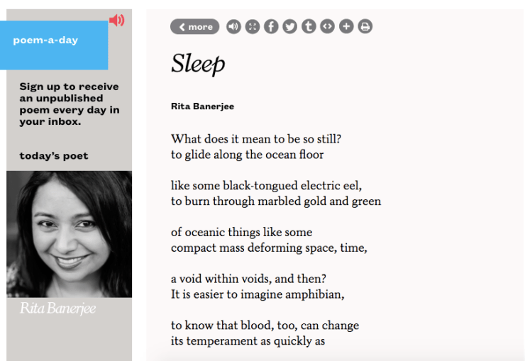 In honor of Asian American and Pacific Islander Heritage Month, the Academy of American Poets has featured a series of poems by modern and contemporary Asian American poets and writers. Rita Banerjee’s poem “Sleep,” which was the Academy of American Poets’s Poem-a-Day on November 30, 2017, is one of the featured audio poems this month on Poets.org. Check out “Sleep” (from Rita Banerjee’s collection Echo in Four Beats) and all the featured Asian American writers on the Academy of American Poets.org!