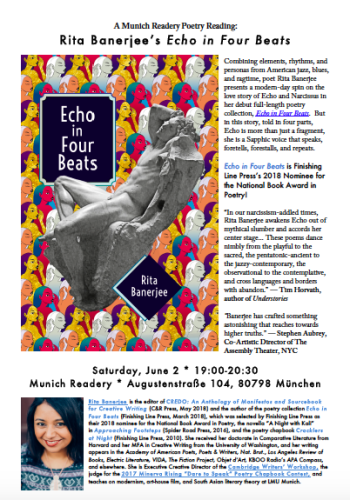 Munich Mag features Rita Banerjee’s reading from Echo in Four Beats at the Munich Readery as one of the top events of June 2. They write: