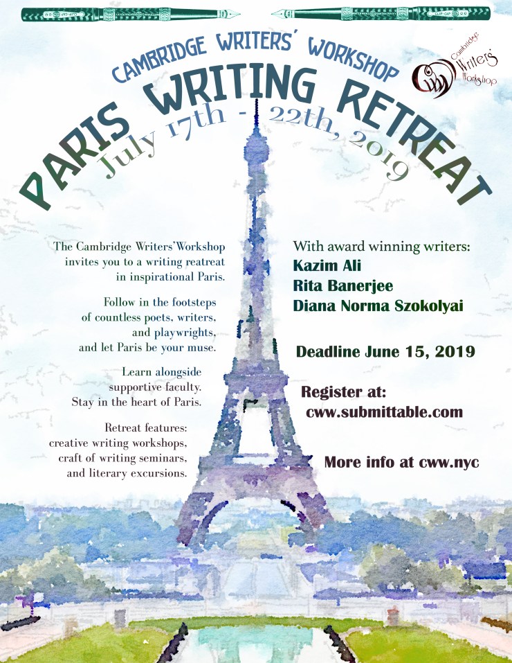 The Cambridge Writers’ Workshop Summer in Paris Writing Retreat will take place from July 17-22, 2019. Situated in heart of Paris’ Montparnasse neighborhood, amongst the fresh and popular open air markets and charming boutiques, the hotel stay is full of Parisian charm and our classes will take place in a beautiful Moroccan themed room that opens to a courtyard that can also be used by our writers. Retreat activities will include craft of writing seminars and creative writing workshops, literary tours of Paris. If you’re serious about writing and want to soak in some exquisite French culture this summer, join our retreat in Paris! The faculty includes award-winning writers Kazim Ali, Rita Banerjee, and Diana Norma Szokolyai. Genres include poetry, fiction, and nonfiction. If you’d like to join us in Paris, France, please apply online at cww.submittable.com by June 15, 2019. More info: cww.nyc