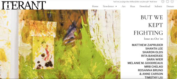 The Ruth Stone Foundation just launched its second issue of Iterant, an interactive multi-media poetry and prose journal. The October 2020 issue of Iterant, “But We Keep Fighting” features the poetry, prose, audio recordings, and art of Anne Carson, Matthew Zapruder, Timothy Liu, Sharon Olds, Dara Weir, Charles Mason III, and Rita Banerjee among other poets and artists.